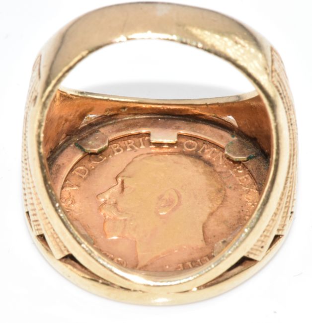 A 9ct gold ring set with a 1918 gold half sovereign, 13g, size P