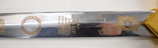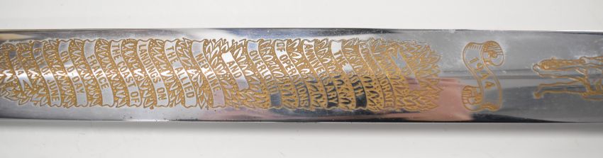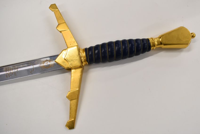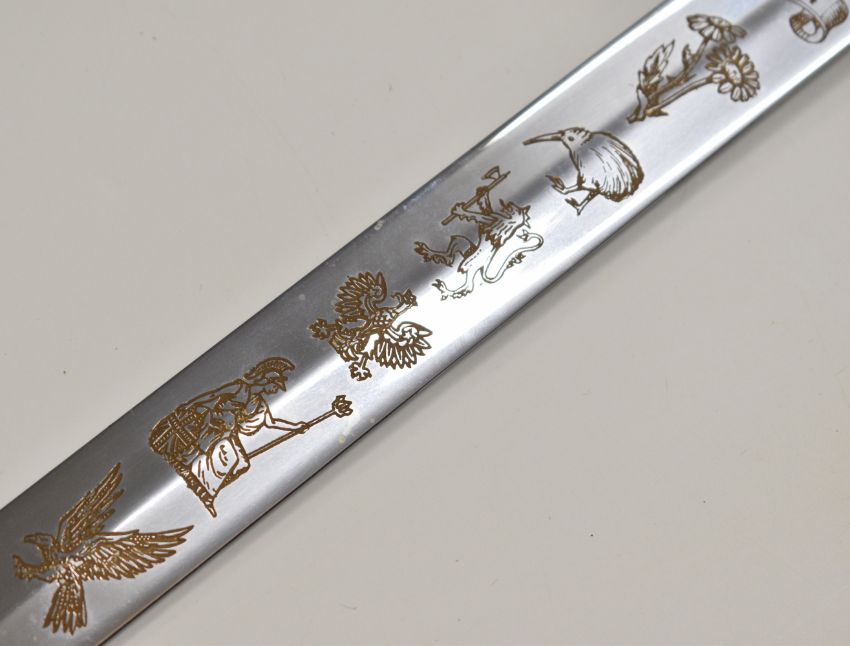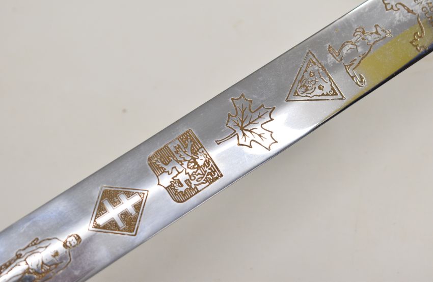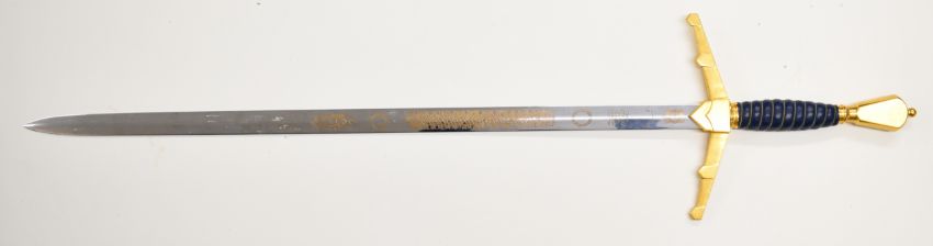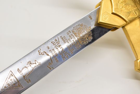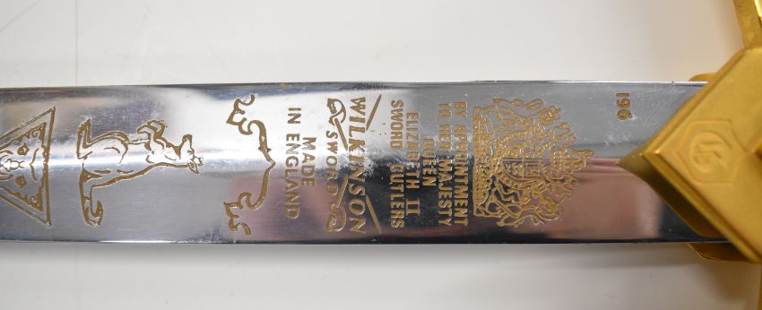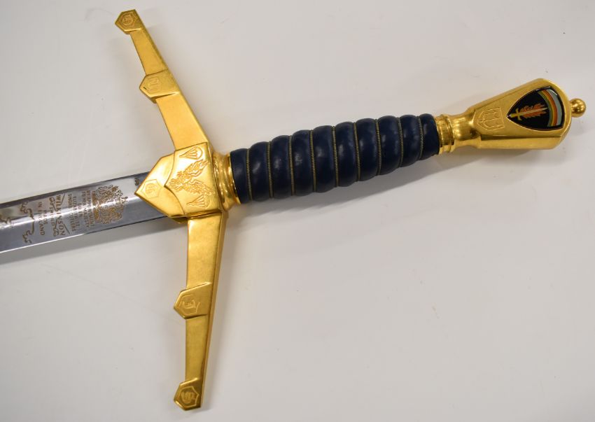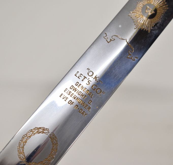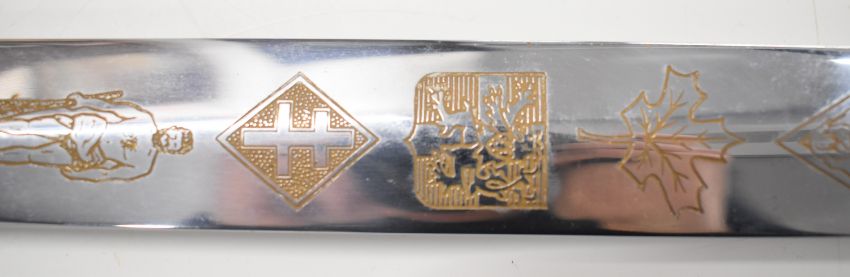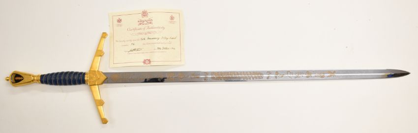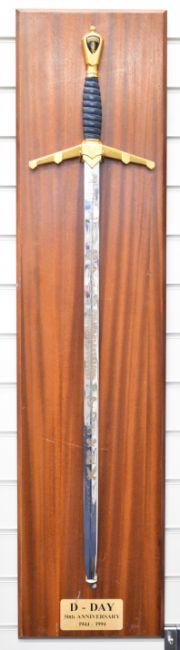 Wilkinson Sword ceremonial limited edition D-Day sword, made to commemorate the 50th anniversary (1944-1994) of the campaign to liberate Europe, the 85cm blade engraved with details about D-Day, the poem 'The Last Post', the national symbols of participating nations, UK, USA, Canada, Poland, etc, with maker's mark on ricasso, blue wire bound handle, gold plated hilt with engraved first letters of the 5 beaches of Normandy (Omaha, Utah, Gold, Sword and Juno) and pommel with the insignia of the Supreme Headquarters Allied Expeditionary Force, length of sword 111cm. Together with certificate of authenticity dated 18th October 1994, number 196, mounted on a wooden presentation board, overall length with presentation board 127cm, width 30cm. PLEASE NOTE: WE ARE NOT ABLE TO OFFER OUR USUAL POSTAGE SERVICE FOR THIS LOT