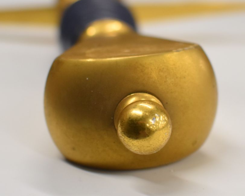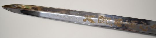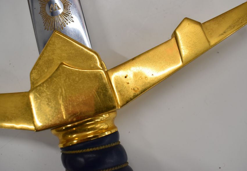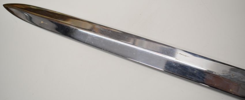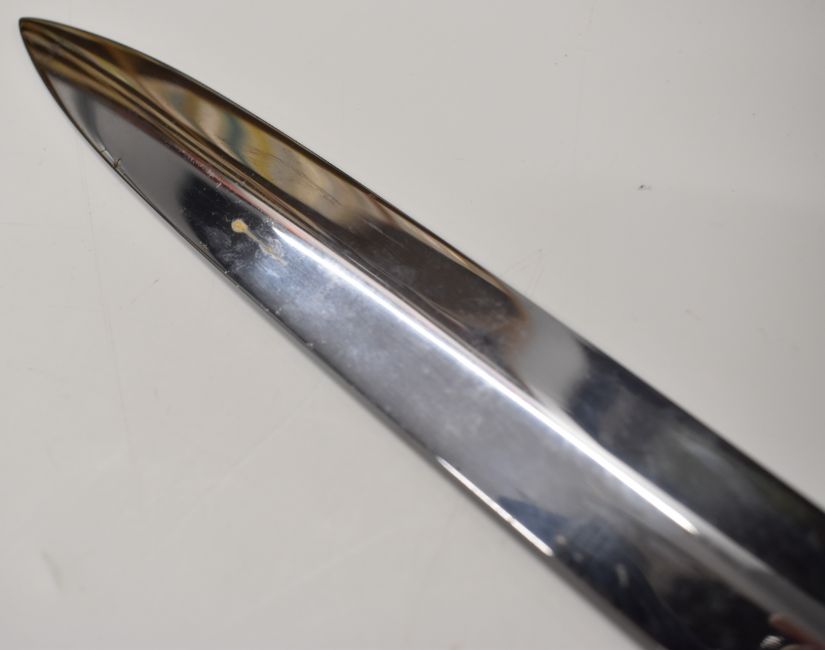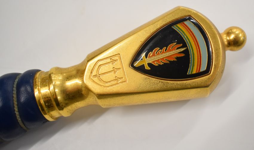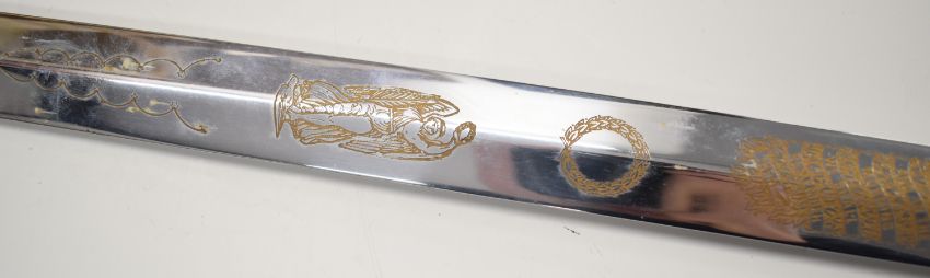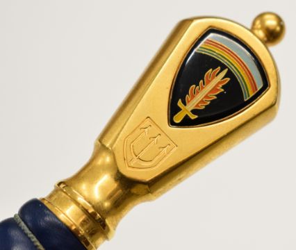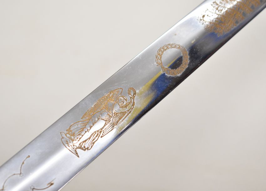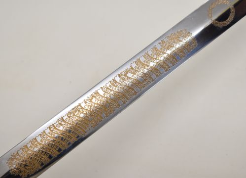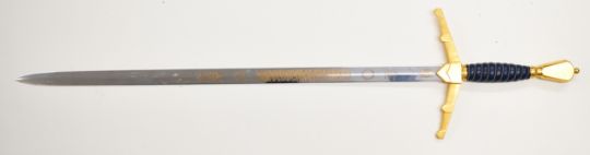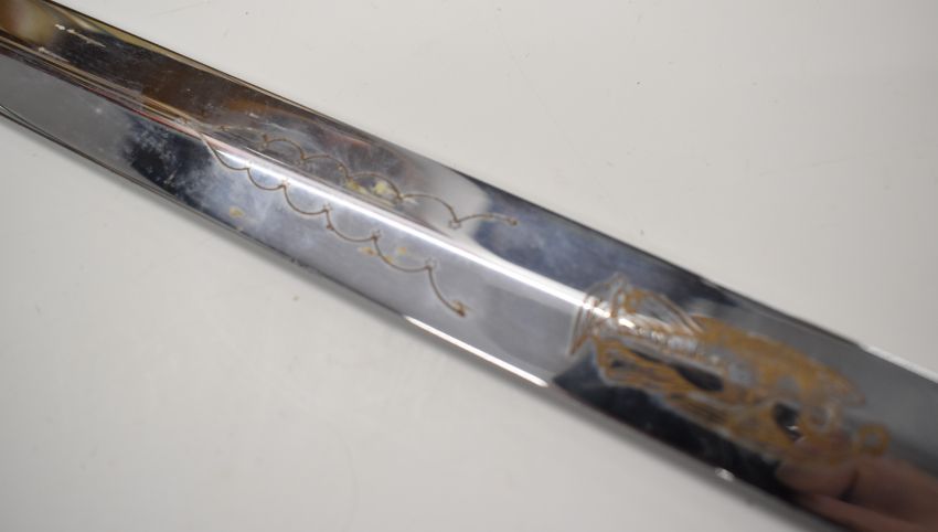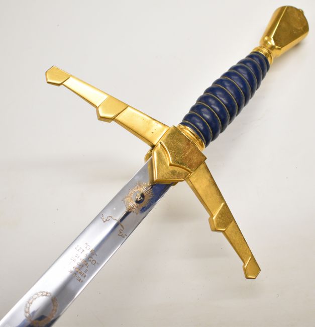 Wilkinson Sword ceremonial limited edition D-Day sword, made to commemorate the 50th anniversary (1944-1994) of the campaign to liberate Europe, the 85cm blade engraved with details about D-Day, the poem 'The Last Post', the national symbols of participating nations, UK, USA, Canada, Poland, etc, with maker's mark on ricasso, blue wire bound handle, gold plated hilt with engraved first letters of the 5 beaches of Normandy (Omaha, Utah, Gold, Sword and Juno) and pommel with the insignia of the Supreme Headquarters Allied Expeditionary Force, length of sword 111cm. Together with certificate of authenticity dated 18th October 1994, number 196, mounted on a wooden presentation board, overall length with presentation board 127cm, width 30cm. PLEASE NOTE: WE ARE NOT ABLE TO OFFER OUR USUAL POSTAGE SERVICE FOR THIS LOT