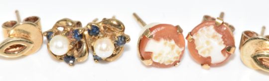 Three pairs of 9ct gold earrings, one set with cameos, one diamonds and the other a pearl and sapphires, 4.2g