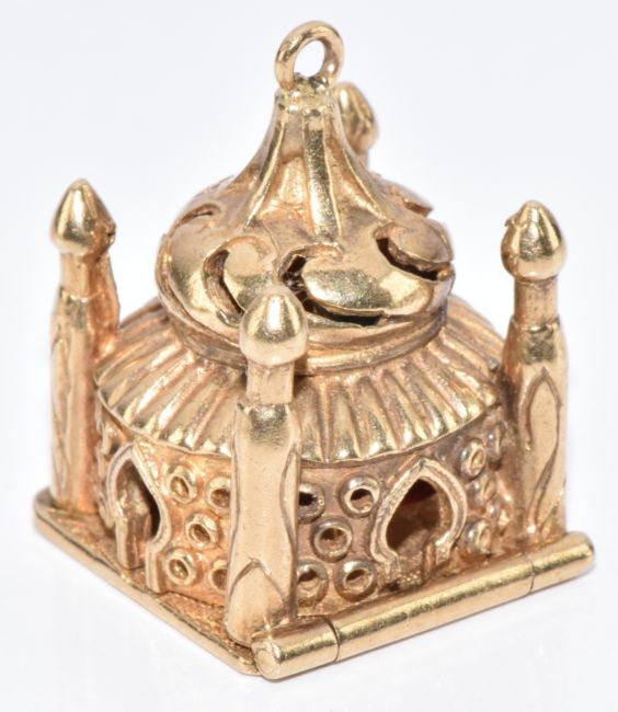 A 9ct gold charm in the form of a temple opening to reveal a man praying, 9.5g, 2 x 1.5cm