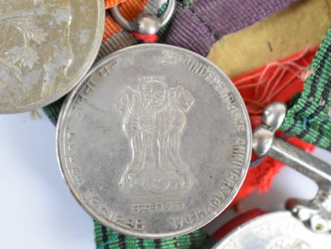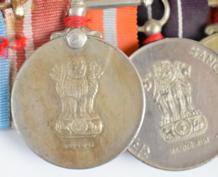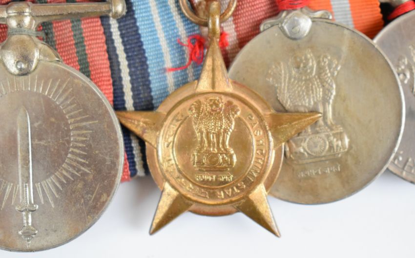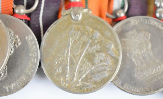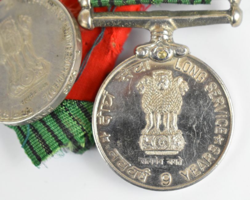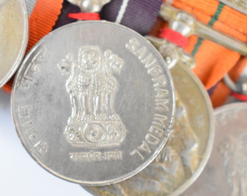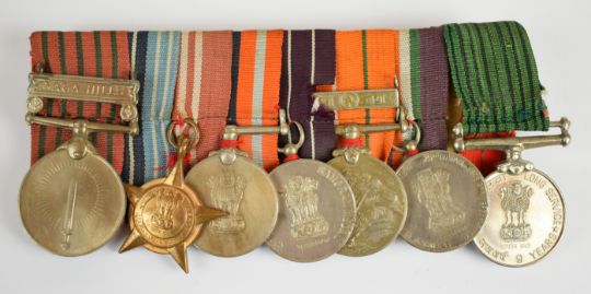 Independent India Medal group of seven named to 4443788 NK-CK Labh Singh Sikh Light Infantry (Sikh L.I.), comprising General Service Medal with Clasp for Naga Hills, Pashchimi Star, Raksha Medal, Sangram Medal, Sainya Seva (Military Service) Medal with Himalaya clasp, 25th anniversary of Indian Independence and a 9 year Long Service Medal
