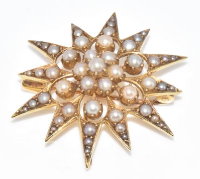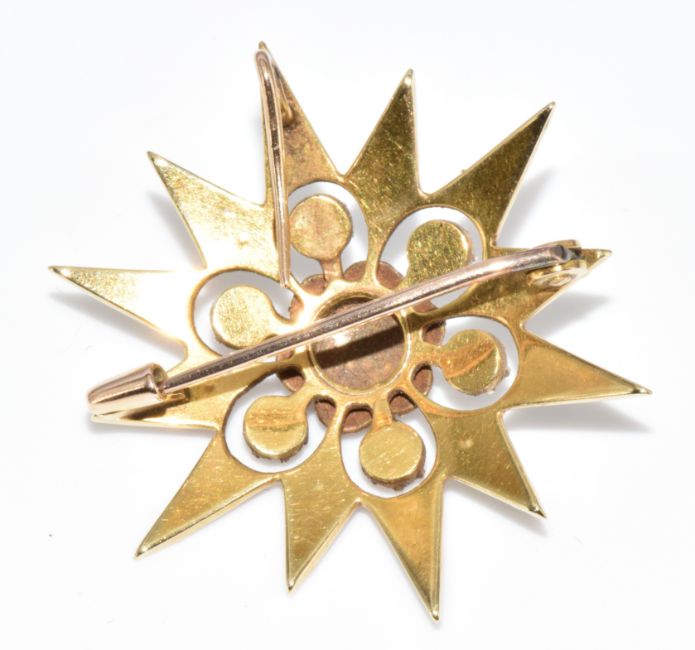 Edwardian 15ct gold brooch / pendant set with split pearls, 5.9g, 3cm (one pearl missing)