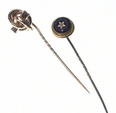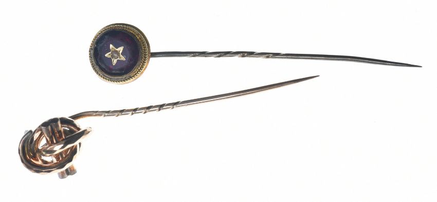Victorian 9ct gold stick pin in the form of a knot (2.7g, 6.2cm) and a yellow metal Victorian stick pin set with a seed pearl (3g)