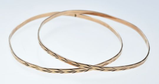 Two rose gold bangles with cut out decoration, 12.4g (tests as 14k gold)