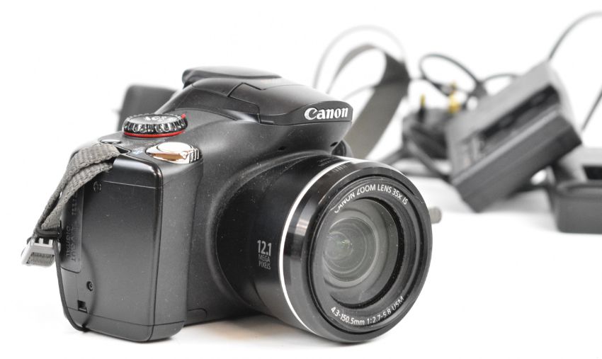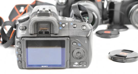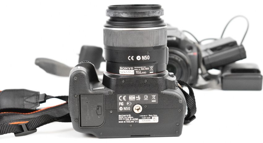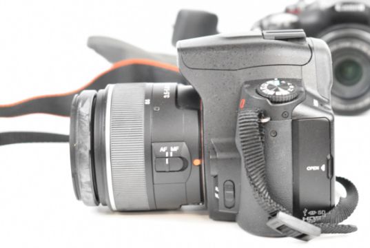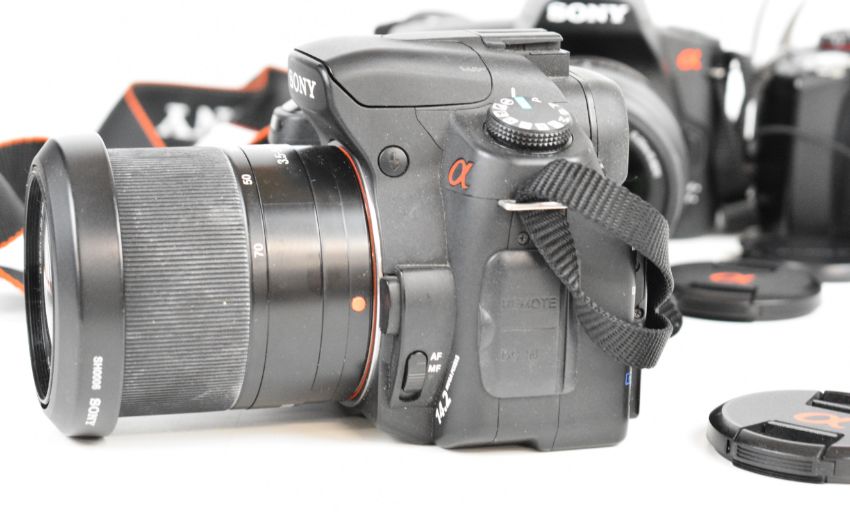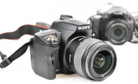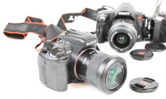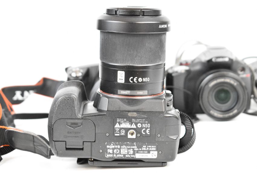 Three digital cameras comprising Sony a290 with 3.5-5.6/18-55 SAM lens, Sony a350 with 3.5-5.6/18-70 lens and a Canon PowerShot SX40HS, with Sony and Canon chargers