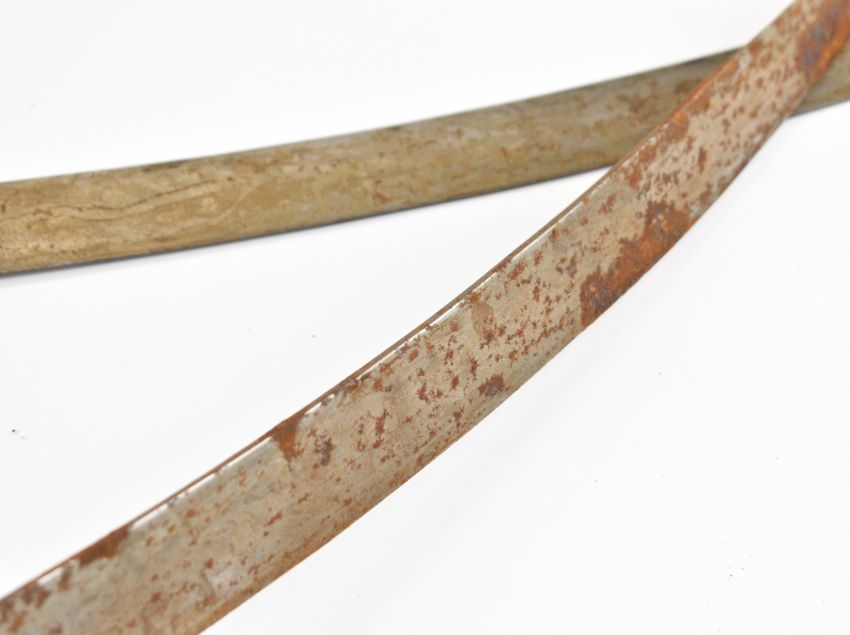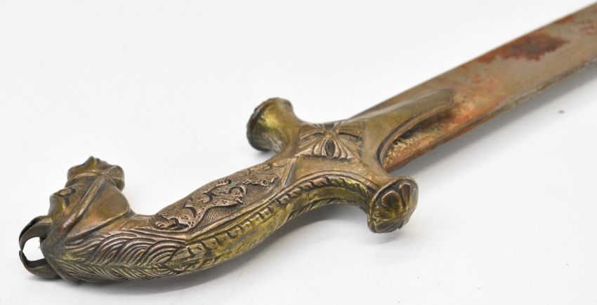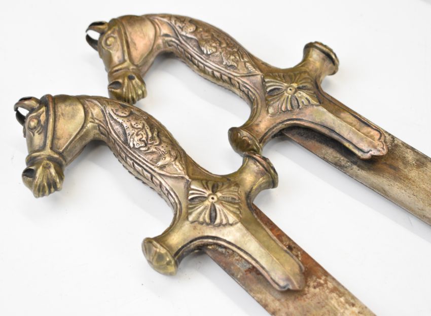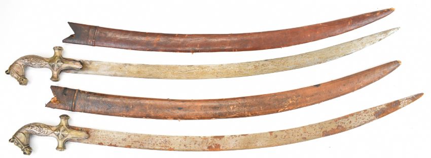 Two Indian / Persian Tulwar with 79cm single edged curved steel blades, hilt decorated with a hunting scene showing a cheetah, flower in the centre of the crossguard and pommel in the shape of a horse head, in leather covered scabbard, overall length 91cm. PLEASE NOTE: WE ARE NOT ABLE TO OFFER OUR USUAL POSTAGE SERVICE FOR THIS LOT