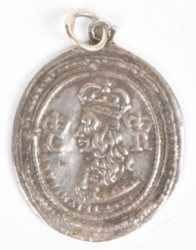 Silver 17thC / Charles II Royalist supporter's pendant / badge or medallion with bust and cypher both sides for Charles II and Queen Catherine, one side with Latin script, 3.8 x 2.2cm