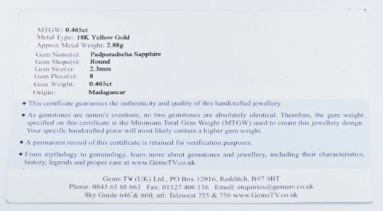 An 18k gold ring set with eight round cut Padparadscha sapphires, with certificate, 3g, size N