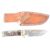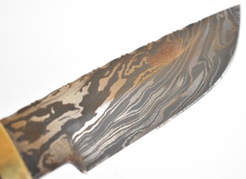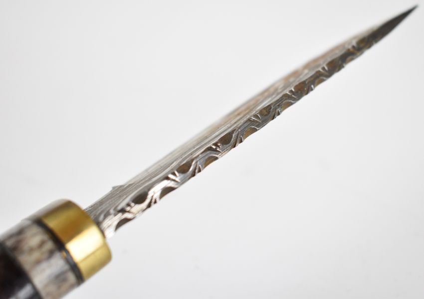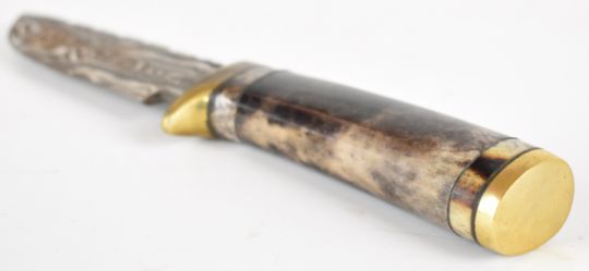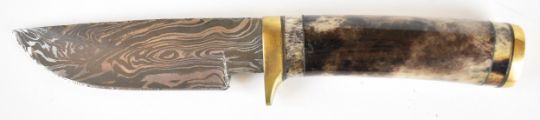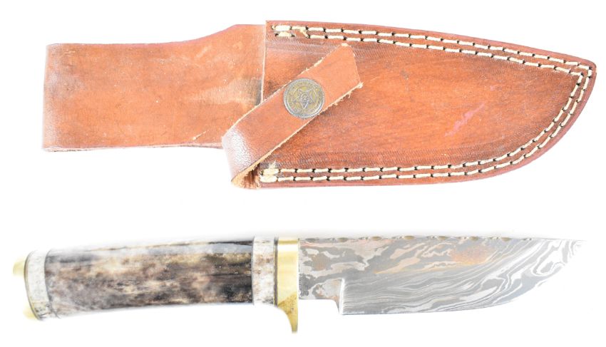 Unnamed hunting knife with horn or similar and brass handle and 12cm Damascus blade, in leather sheath with button stamped 'Great Seal of the State of Oklahoma'. PLEASE NOTE: WE ARE NOT ABLE TO OFFER OUR USUAL POSTAGE SERVICE FOR THIS LOT