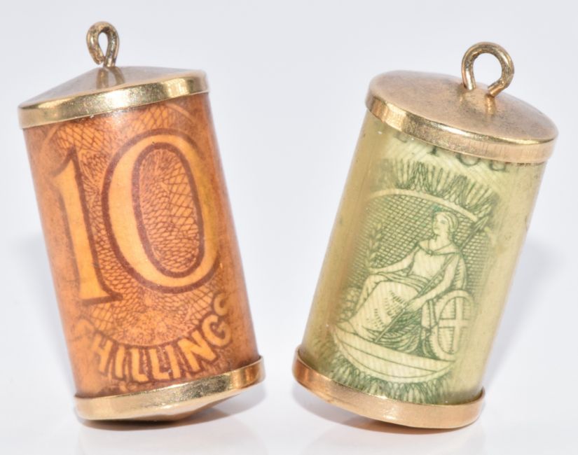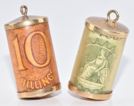 Two 9ct gold charms with £1 note and 10 shilling note, 2cm, 6.7g