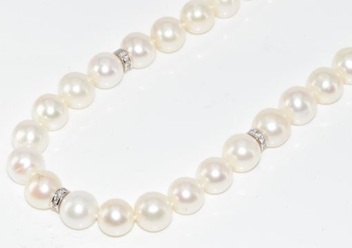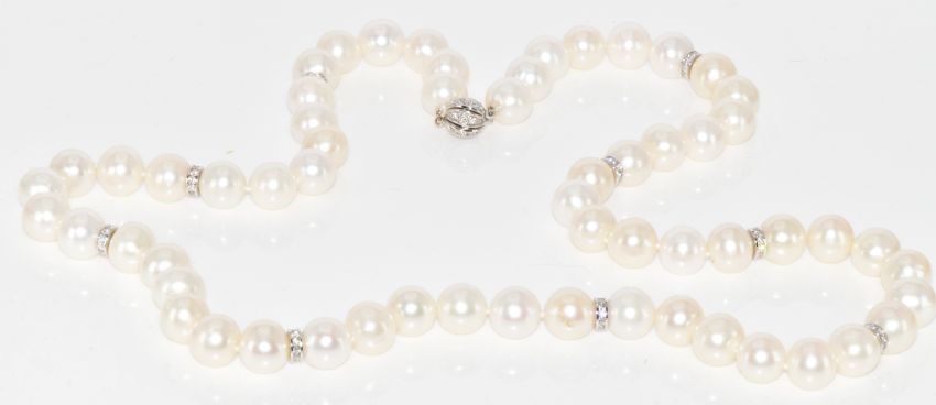A single strand of cultured pearls with 18ct white gold spacers and sphere clasp set with diamonds, 118g, 70cm, pearls approximately 10-11mm each