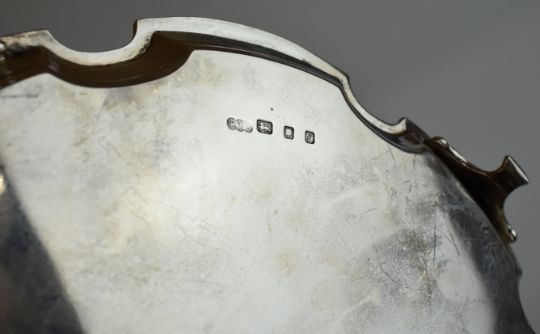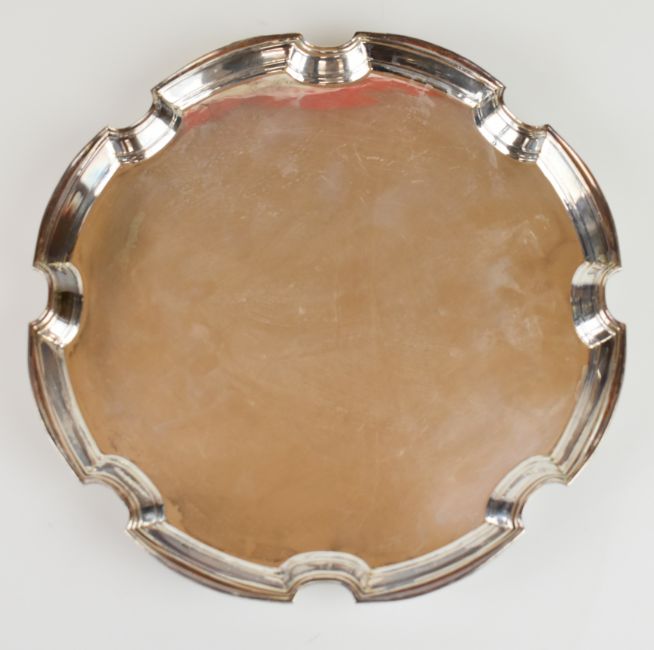 Elizabeth II hallmarked silver salver with shaped edge, raised on four feet, London 1961, maker's mark MDA, diameter 28cm, weight 813g