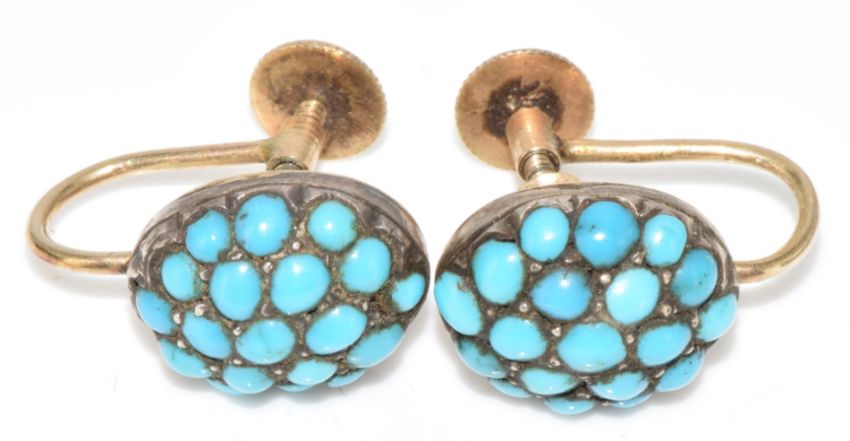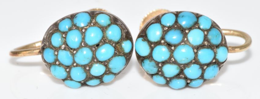 A pair of Victorian yellow metal earrings set with turquoise cabochons, 3.7g (test as 9k)