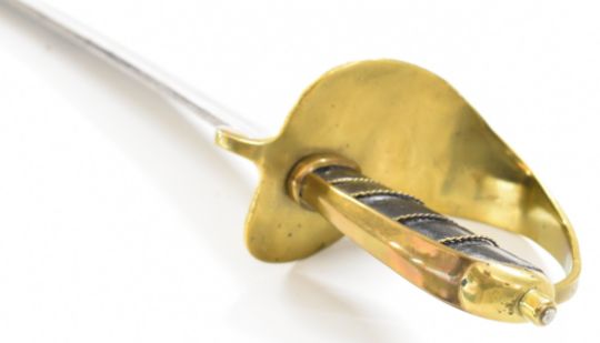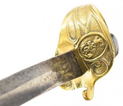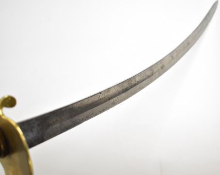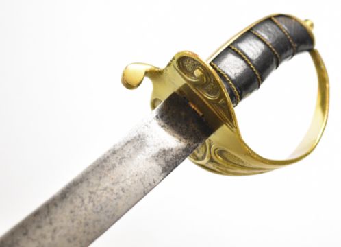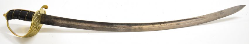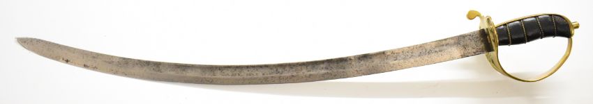 British circa 1820s Naval sabre / hanger, with 60cm single edged curved blade, swept quillon, gilt hilt, guard decorated with fouled anchor and wire bound handle, overall length 71cm. PLEASE NOTE: WE ARE NOT ABLE TO OFFER OUR USUAL POSTAGE SERVICE FOR THIS LOT