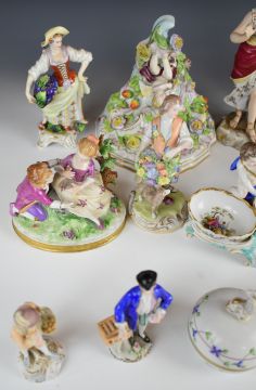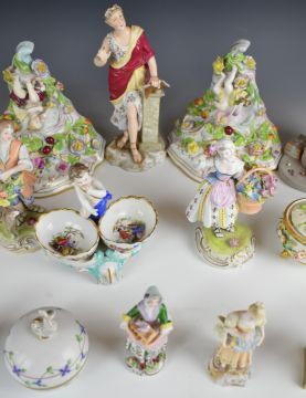 Porcelain figures and wall brackets including Herend, Dresden, Berlin, Sitzendorf, Crown Derby, tallest 17cm