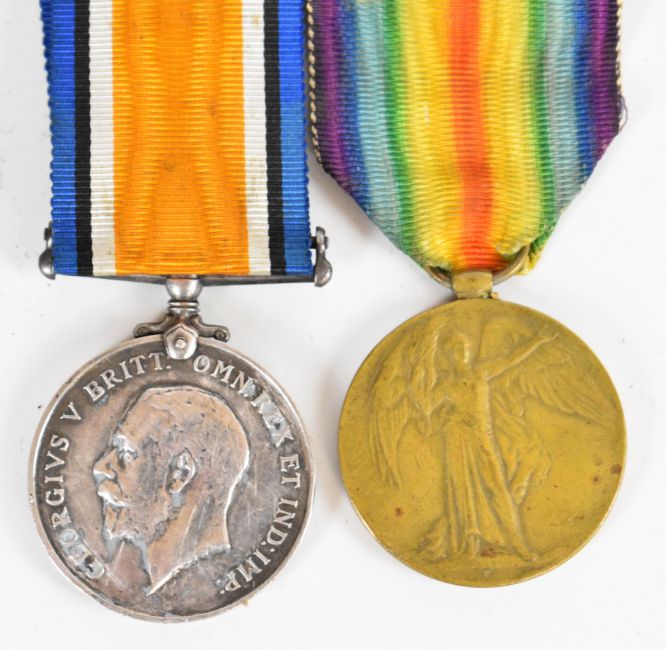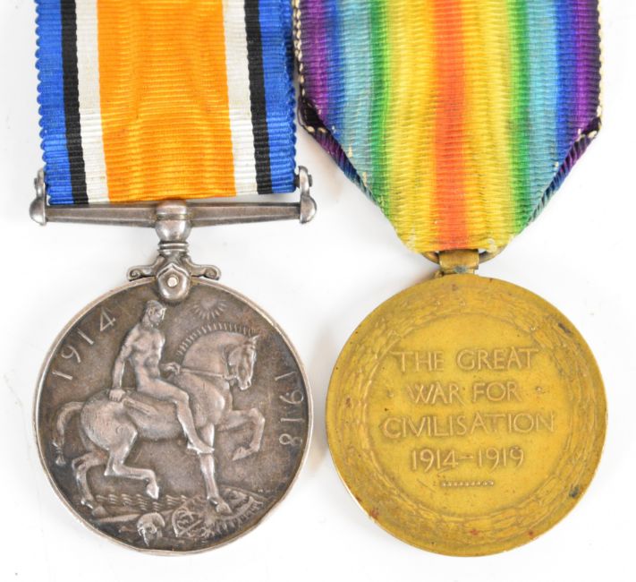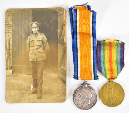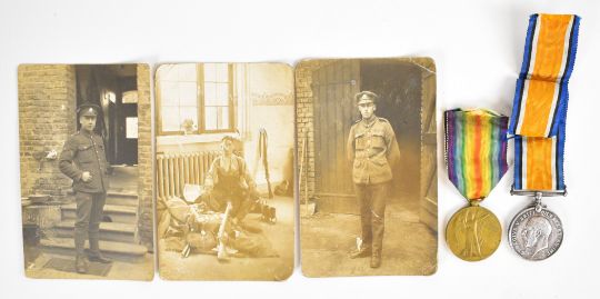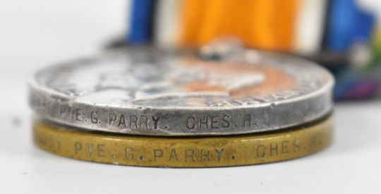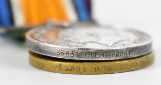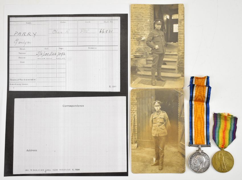WW1 medal pair comprising Victory Medal and British War Medal named to 66831 Pte. G. Parry (Gwilym Parry), Cheshire Regiment (Ches.R.), together with three photographs of the recipient and his medal card