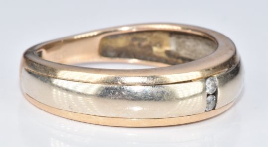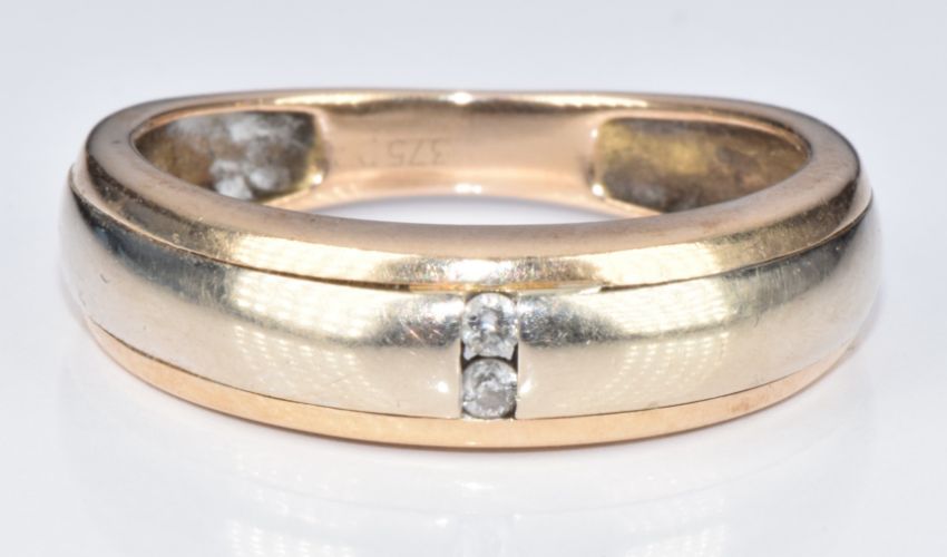 A 9ct bi-coloured gold ring set with two diamonds, 3.1g, size P