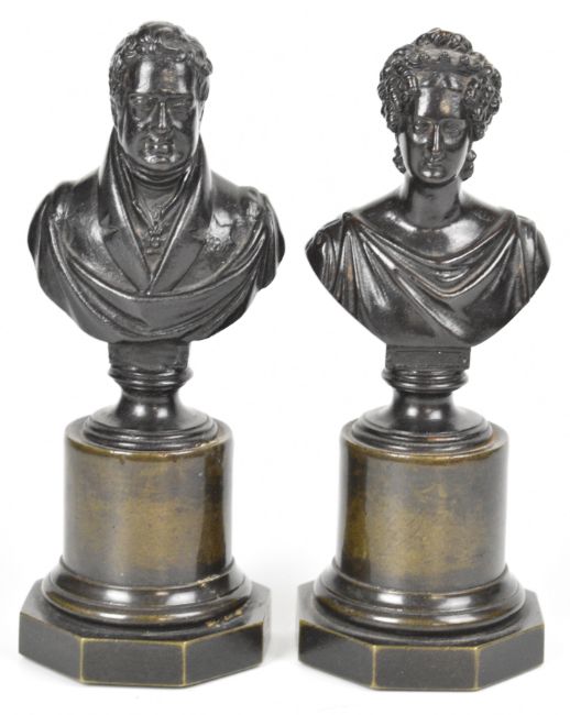 Bronze bust of the Duke of Wellington on cylindrical and octagonal base, height 15.5cm, together with a similar bust of a lady