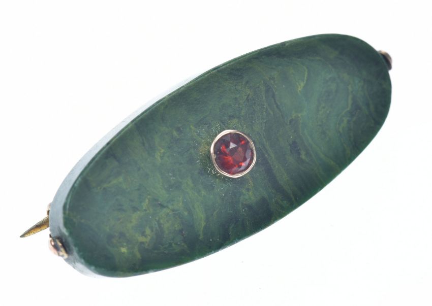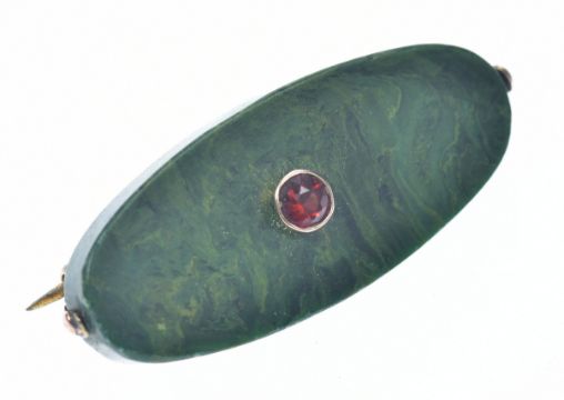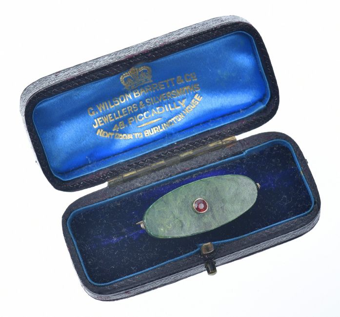 A 9ct gold brooch set with hardstone and a garnet by Murrle Bennett, in antique box, 3cm, 3.9g