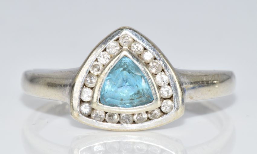 A 9ct white gold ring set with a trillion cut topaz surround by diamonds, 2.8g, size S