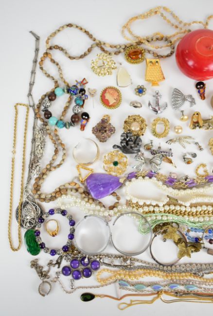 A collection of jewellery including Art Deco clip, vintage brooches, Miracle ship brooch, micro mosaic brooch, vintage beaded necklaces, 9ct gold plated bangle, silver bangle set with tiger's eye, Empire diamanté bracelet, etc