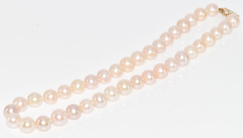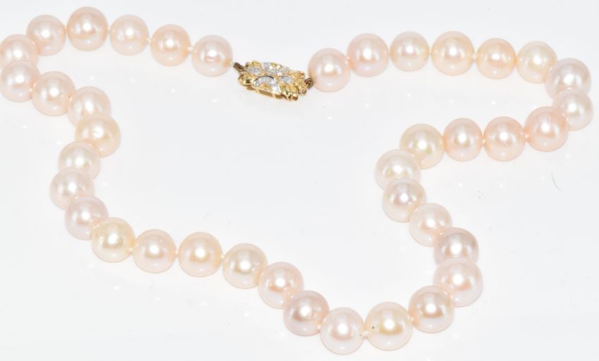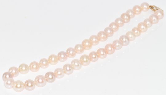 A single strand of cultured pearls with 14k gold clasp set with diamonds, 60.2g, 40cm, pearls approximately 9mm each