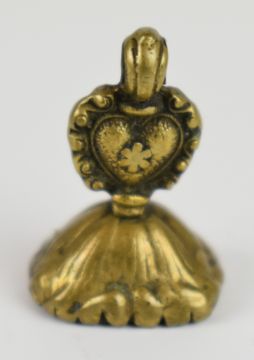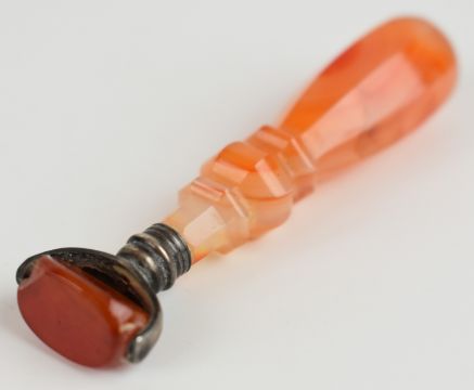 Figural intaglio seal depicting two soldiers, possibly Roman, Islamic oval hardstone tablet, gilt metal intaglio ship seal with heart finial and a carved agate seal, tallest 6cm