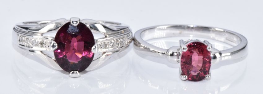 Two 9k white gold rings, one set with an oval cut rubellite and diamonds and the other an oval cut rubellite, with certificates, 6.4g, size N