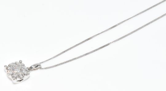 A 9ct white gold pendant set with round brilliant cut diamonds in a cluster, the total approximately 0.5ct, on 9ct white gold chain, 2.2g, diameter of pendant 8mm, chain 45cm