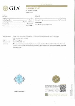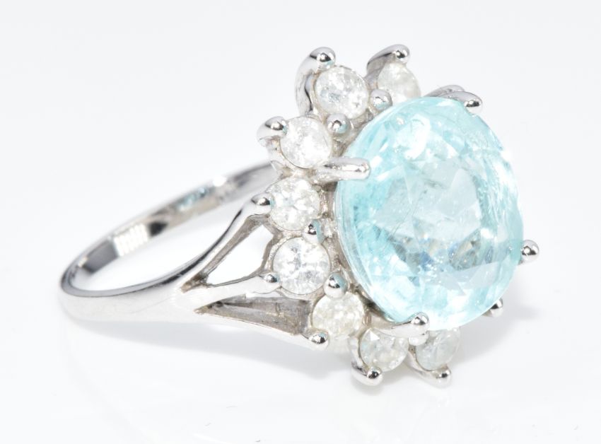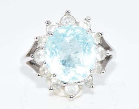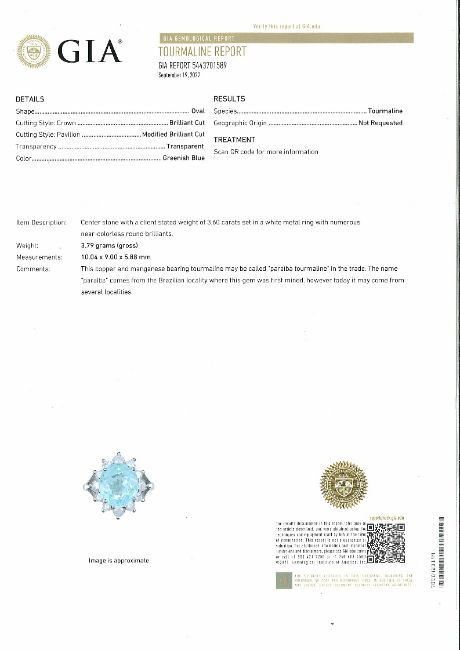 A white metal ring set with an oval cut greenish blue Paraiba tourmaline of approximately 3.6ct surrounded by round cut diamonds, with GIA report, 3.8g, size J/K