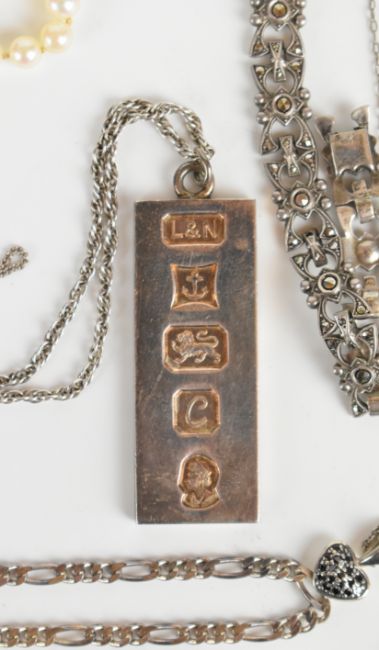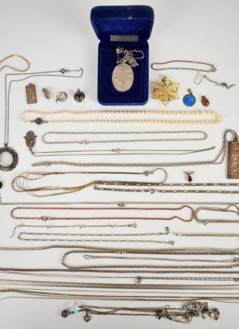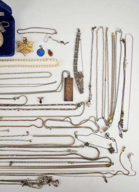 Thirty one silver chains, two silver ingots, single strand of cultured pearls, eight silver pendants, matching necklace and bracelet and three bracelets, 283g