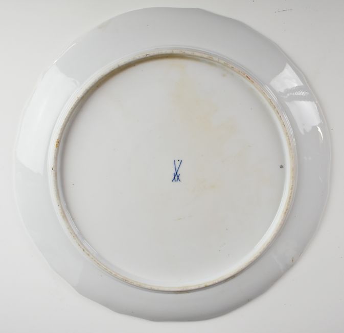 Meissen shallow charger with floral decoration and blue crossed swords mark verso, diameter 33cm