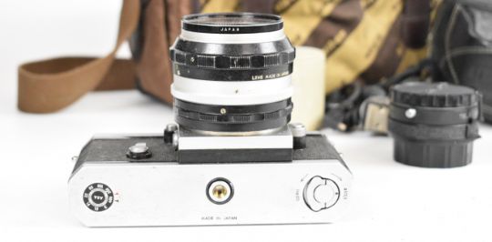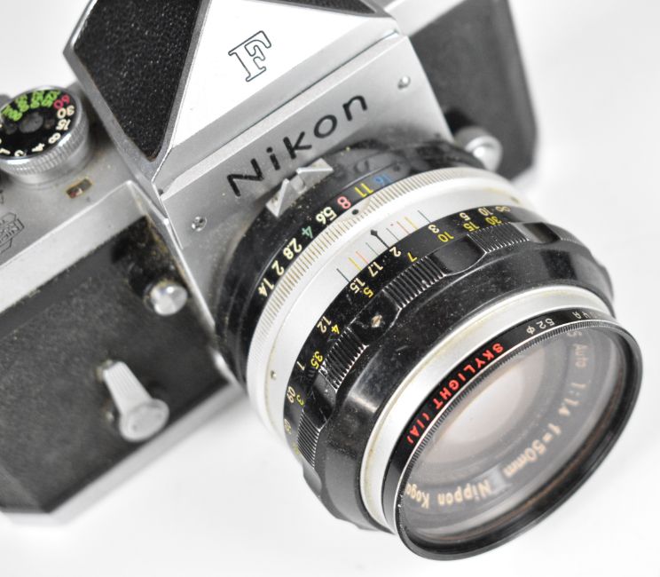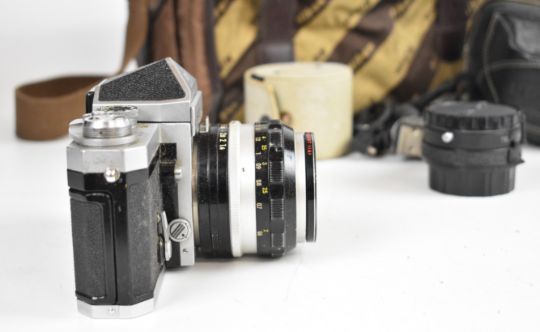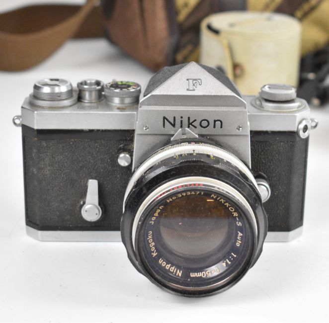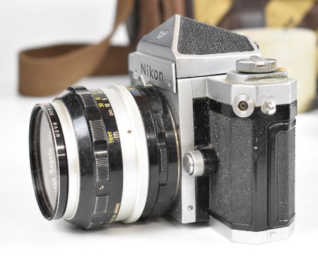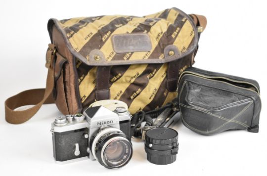 Nikon F 35mm SLR camera with eye level prism finder, Nikkor-S 1:1.4 f=50mm lens, Komura Telemore 95 converter and Nikon bag, serial number of camera body 6556136