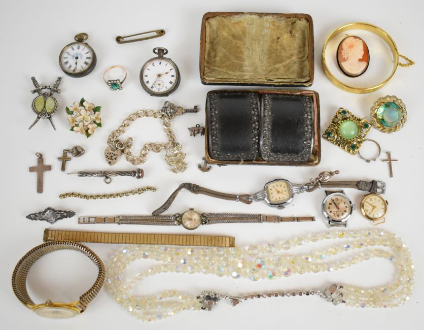 A collection of jewellery, some brooches including 800 grade cameo, pair of buckles by Boulton and Smith, silver including charm bracelet, brooch, charms, cross pendant and watches, 9ct gold cased watch, silver propelling pencil, 9ct and silver ring etc