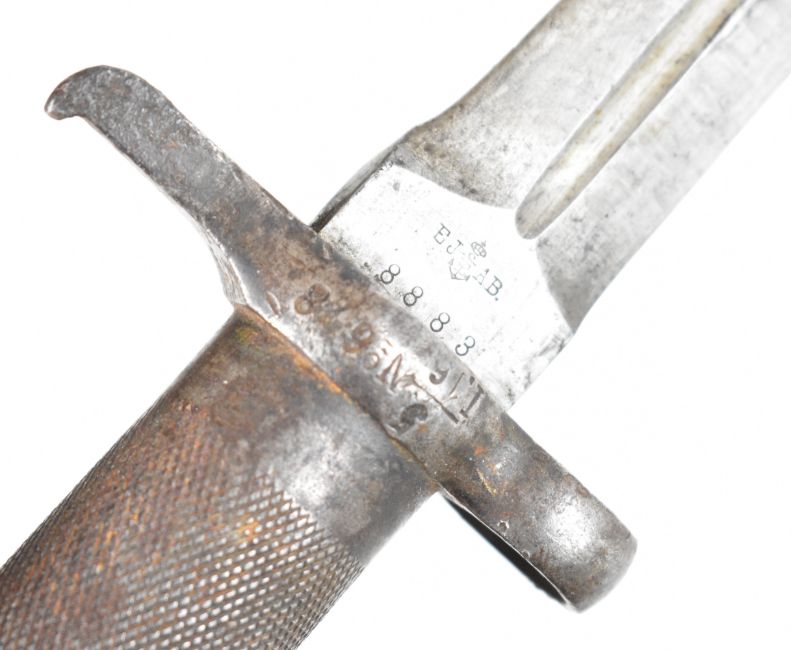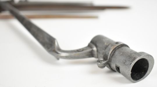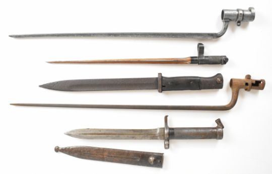 Five bayonets including Swedish m1896 bayonet with 20.5cm blade, EJ AB maker's mark and numbered 8883 to ricasso, chequered steel grip and steel scabbard and three spike bayonets, including two for a musket / Brown Bess. PLEASE NOTE: WE ARE NOT ABLE TO OFFER OUR USUAL POSTAGE SERVICE FOR THIS LOT