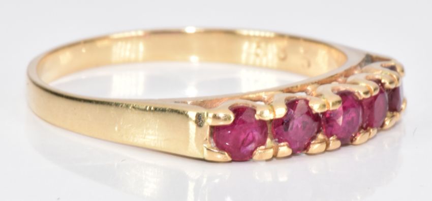A 9ct gold ring set with five round cut rubies, 2g, size O