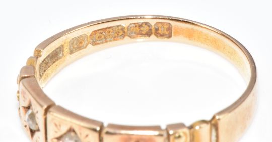 Victorian 15ct gold ring set with three rose cut diamonds in star settings, Birmingham 1894, 2.7g, size M