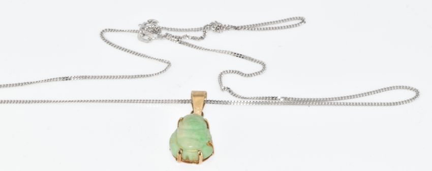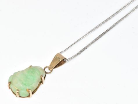A 9ct white gold chain (48cm, 2.3g) and yellow metal pendant set with jadeite carved in the form of a Buddha (3.2g, 2.5cm)