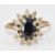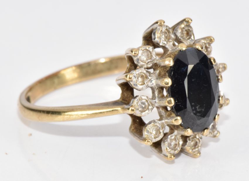 A 9ct gold ring set with an oval sapphire of approximately 1.4ct surrounded by diamonds, 2.4g, size K