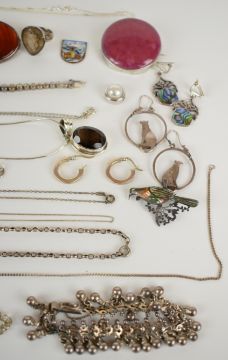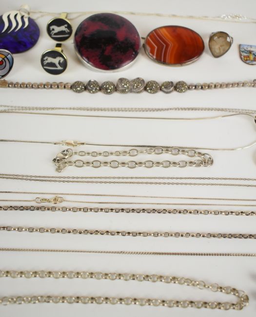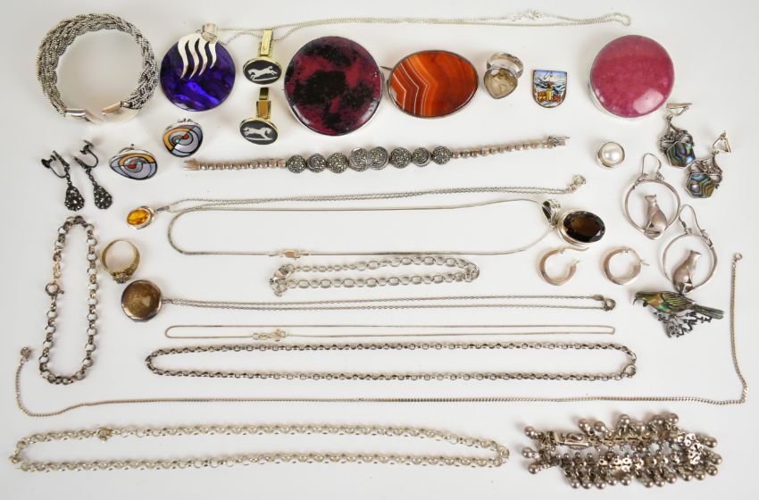 A collection of mainly silver jewellery including four pairs of earrings, four bracelets, brooch, two pendants, chains, two rings, locket, cat earring, bangle (198g), two Ruskin brooches, Wedgwood cufflinks, etc