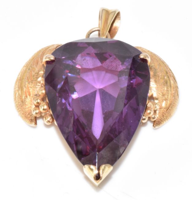 A 14k gold pendant set with a pear cut synthetic sapphire, 13.5g, 4cm