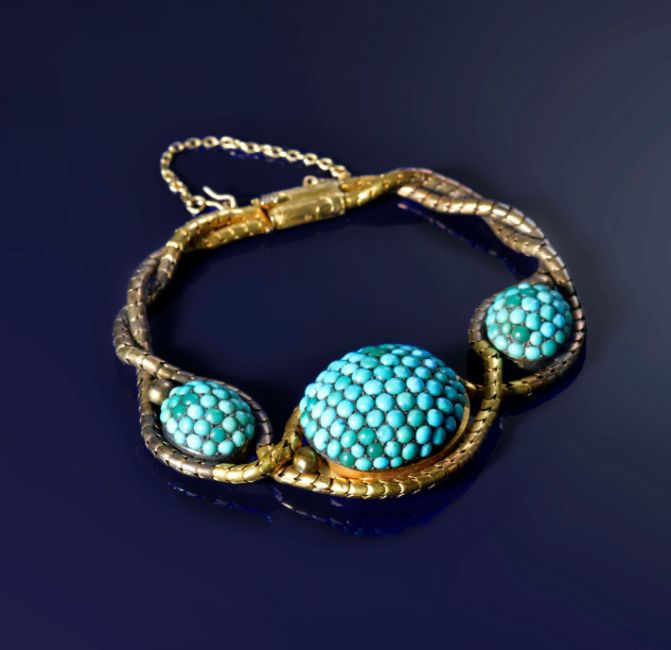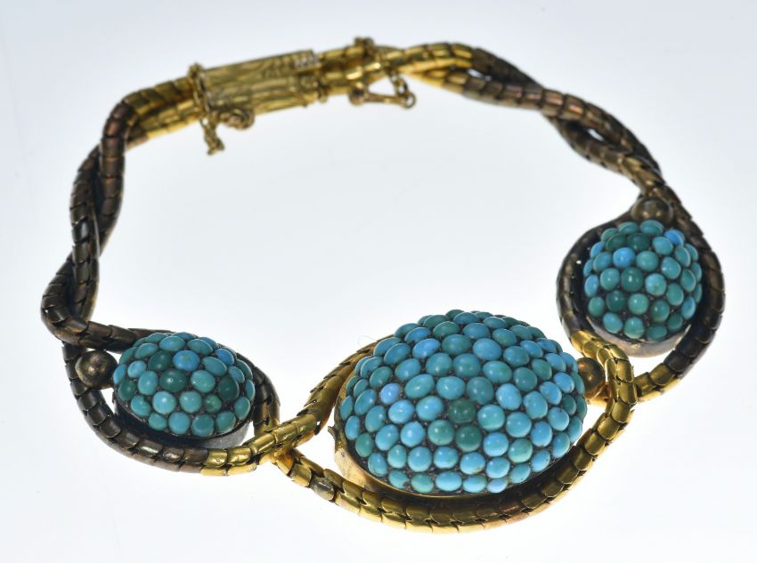 Victorian bracelet made up of fancy links and three domes set with turquoise cabochons, with a locket compartment verso, 28.6g, 18cm. Tests as 18k gold