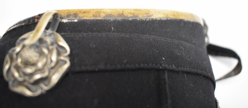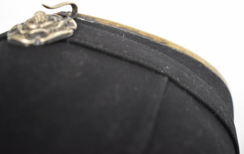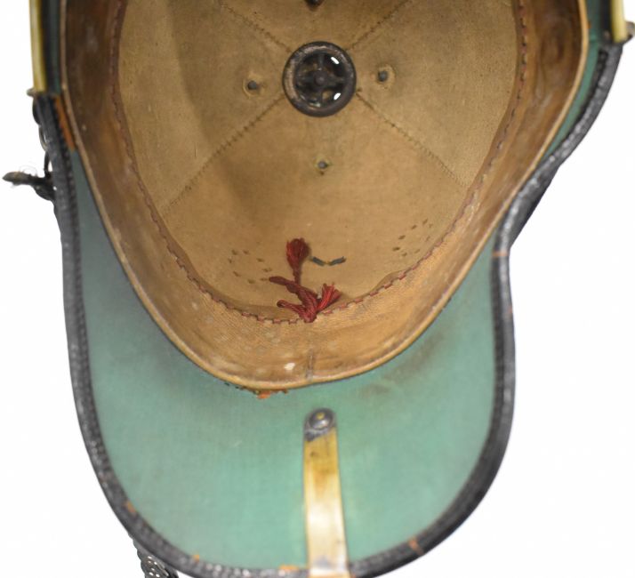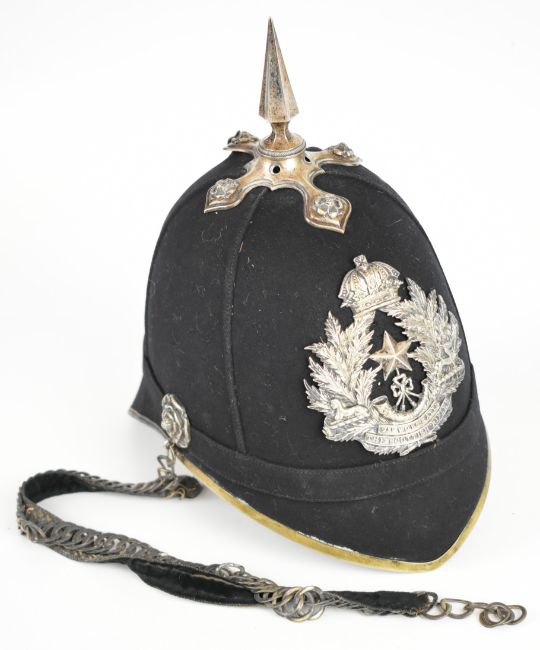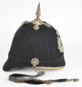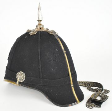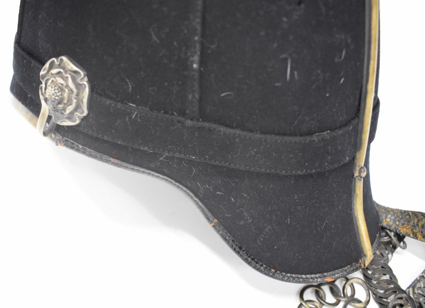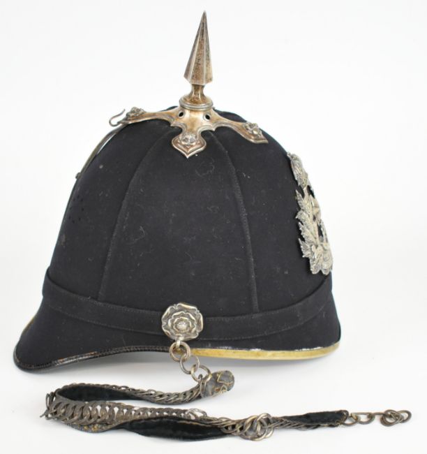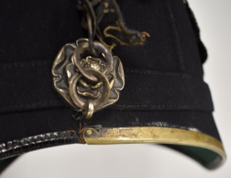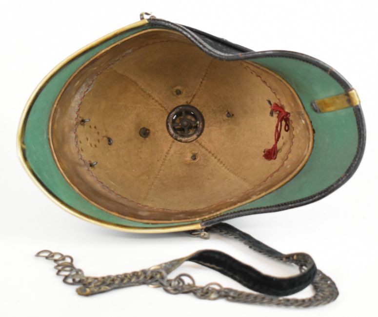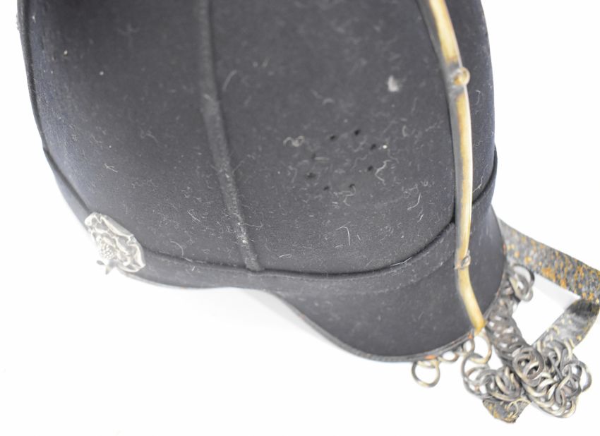 Victorian British Army helmet of the 2nd Volunteer Battalion, The Scottish Rifles, plate badge to the front, top mount with spike, ear rosettes and cloth backed chin chain, interior with leather sweatband, with some indistinct markings. See lot 282 for associated uniform