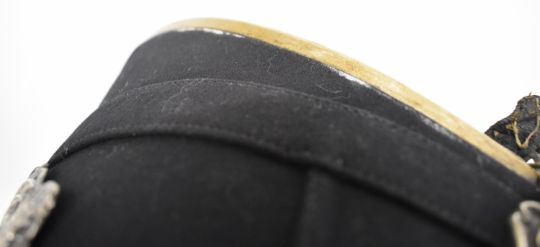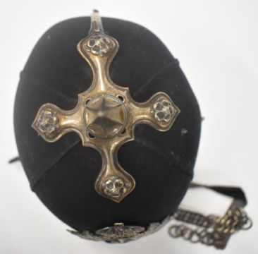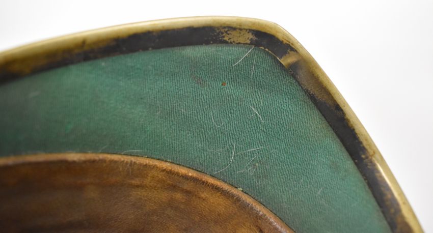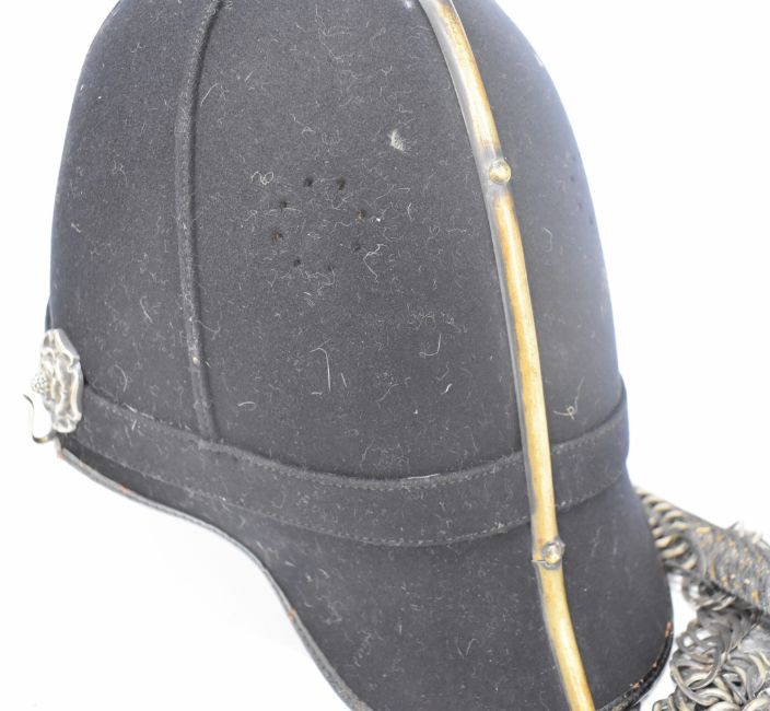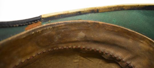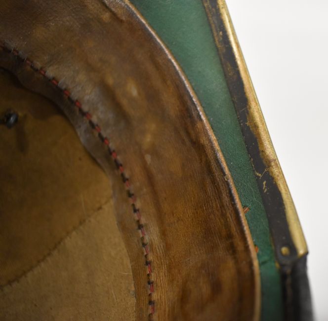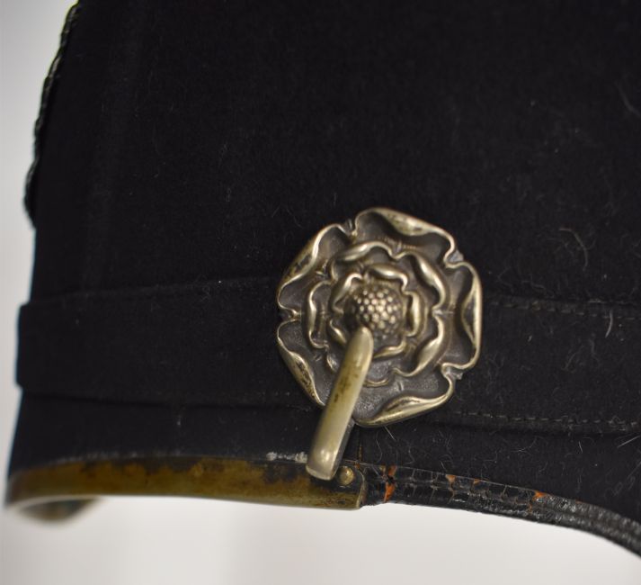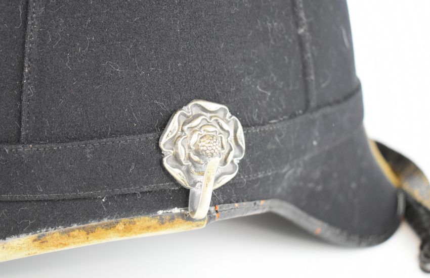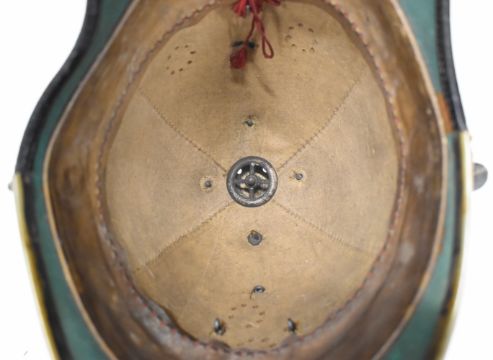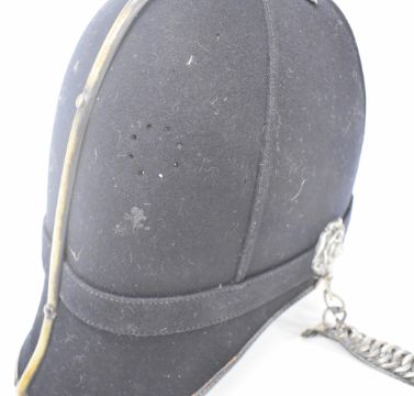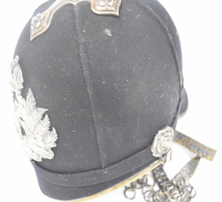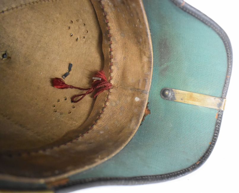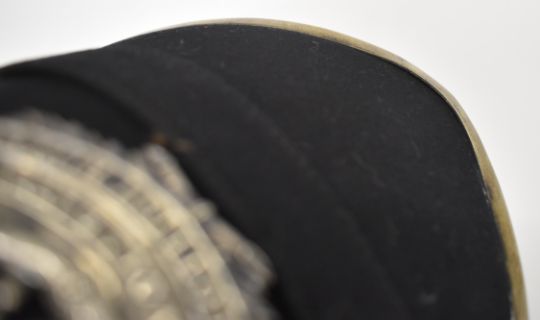 Victorian British Army helmet of the 2nd Volunteer Battalion, The Scottish Rifles, plate badge to the front, top mount with spike, ear rosettes and cloth backed chin chain, interior with leather sweatband, with some indistinct markings. See lot 282 for associated uniform