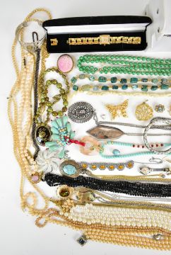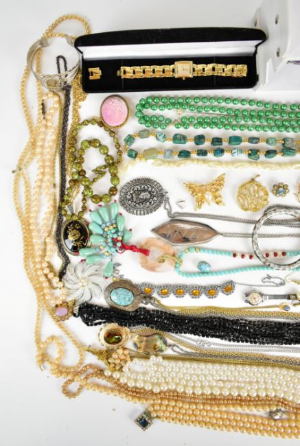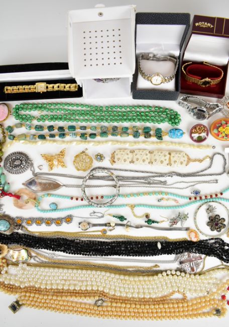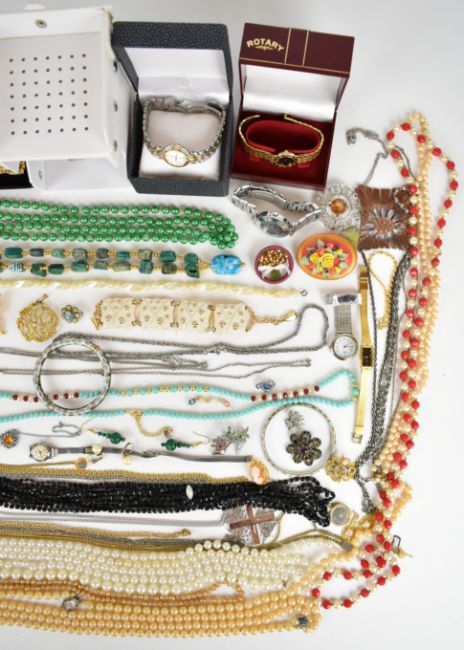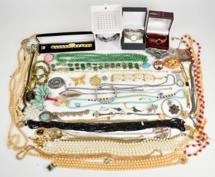 A collection of jewellery including Sarah Coventry brooch and pendant, Exquisite pendant, cloisonné bangles, beads, watches, Moda pendant etc