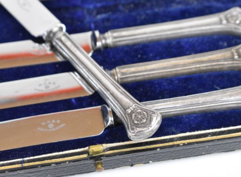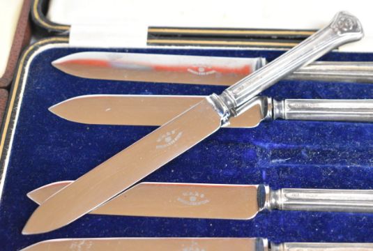 Cased set of six Elizabeth II hallmarked silver coffee bean spoons, Sheffield 1952, maker Cooper Brothers & Sons Ltd and a cased set of six hallmarked silver handled knives, weight of spoons 32g all in