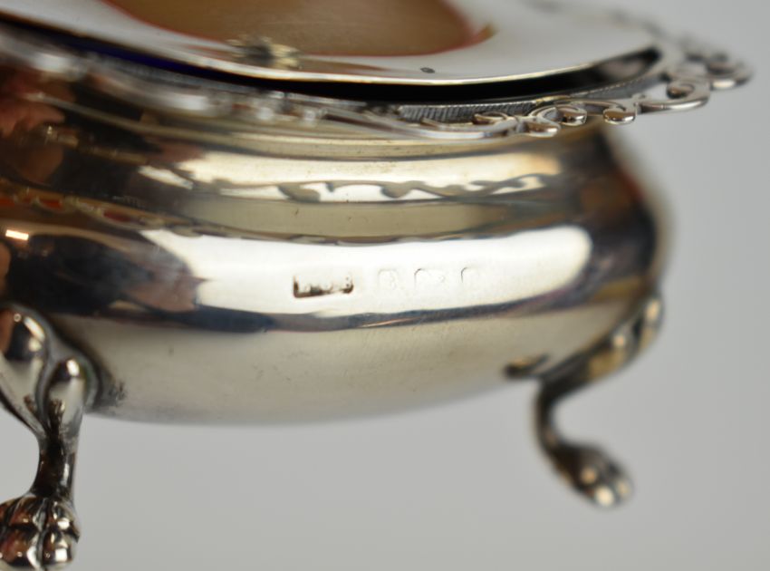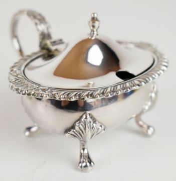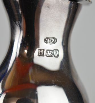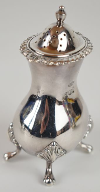 Albert Edward Jones Elizabeth II hallmarked silver pepper and mustard with spoon, Birmingham 1984, height of pepper 10cm, together with a further hallmarked silver mustard and spoon and nine pre 1947 silver 3d coins including three pre 1920 examples, weight excluding 3d pieces and glass liners 315g