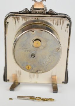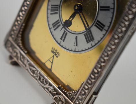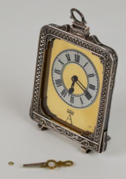 Imhoff Elizabeth II hallmarked silver limited edition (14/500) desk or dressing table 8 day clock or timepiece, with swivelling feet and hinged loop to top, Birmingham 1986, maker's mark HW, height 10.5cm