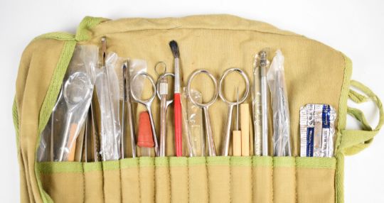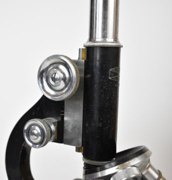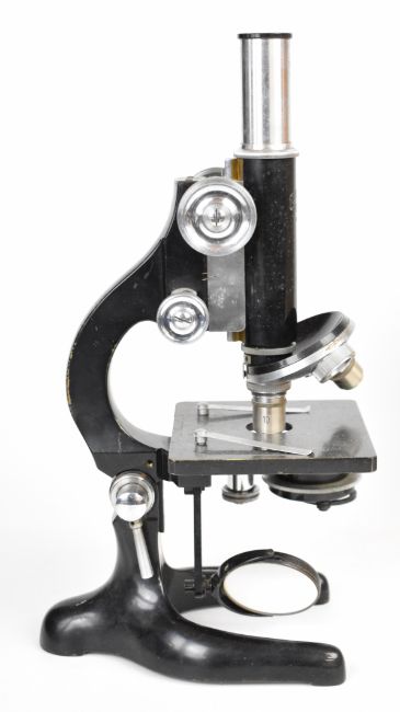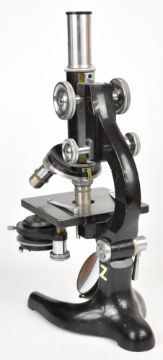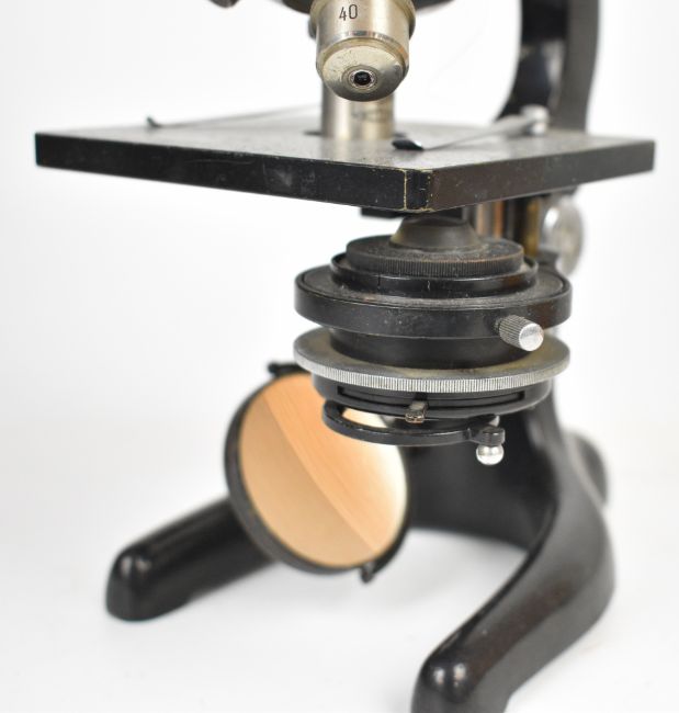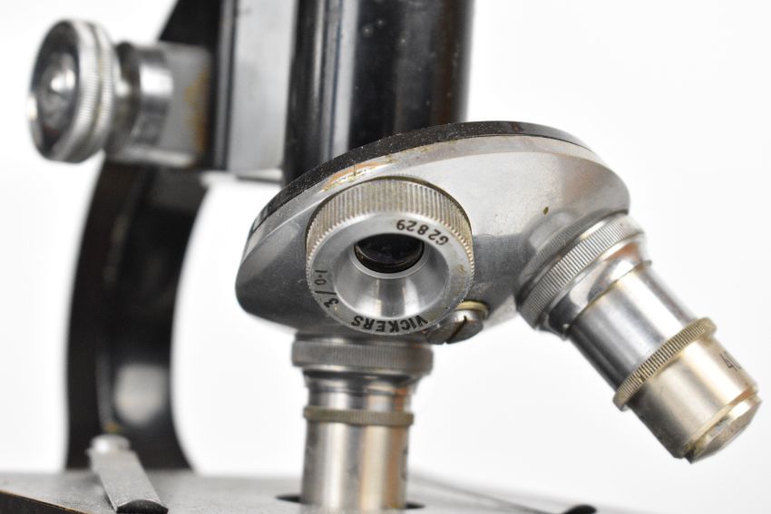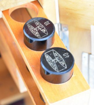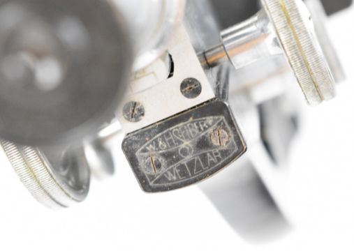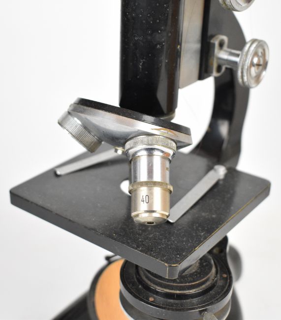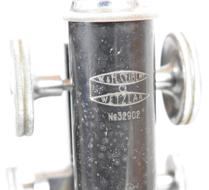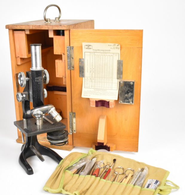 W & H Seibert Wetzlar microscope with three lens carousel, serial number 32902, in original carry case with two eyepiece cases and a quantity of tools for preparing slides